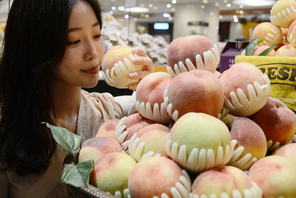시간이 지나 물러질수록 당도가 높아지는 백도중에 가장 최상위급인 '천중백도'가 롯데백화점 동래점 지하 1층 식품관에서 판매, 모델들이 제품을 홍보하고 있다. (사진=롯데백화점)