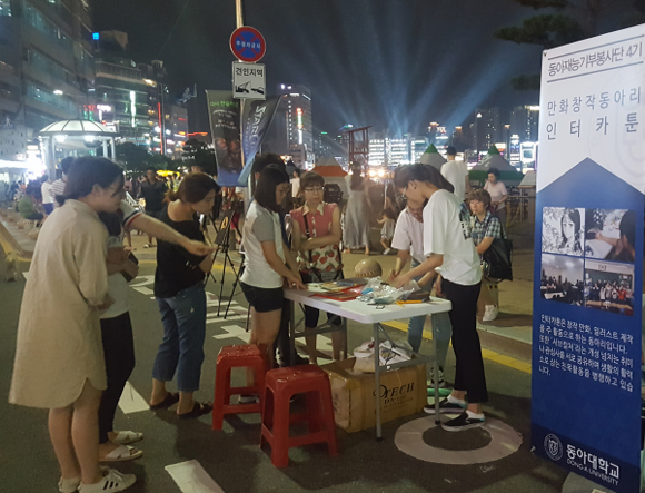 ▲지난달 29일 광안리 '차 없는 문화의 거리'에서 동아대 창작만화동아리 '인터카툰' 학생들로 구성된 동아 재능기부봉사단이 전시 및 체험 재능기부 활동을 하고 있다.