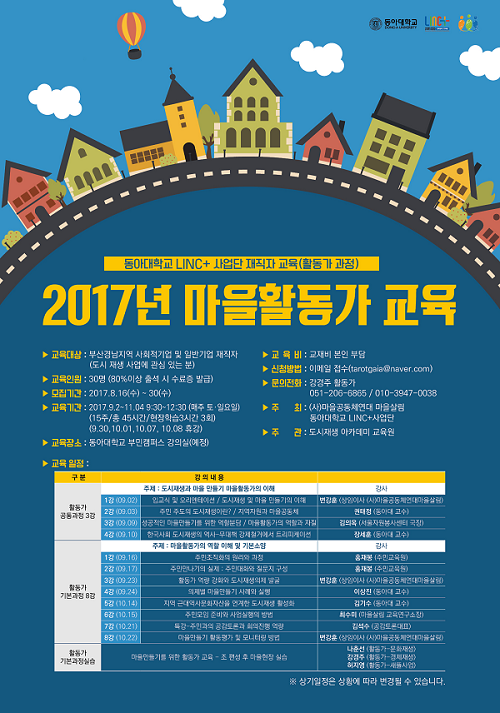 동아대학교는 부산·경남 기업 재직자들을 대상으로 '도시재생 아카데미 마을공동체 정책분야 지도자과정'과 '마을활동가 교육과정'을 개설한다고 18일 밝혔다.