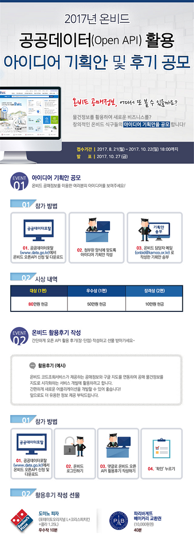 이번 공모는 국민들이 '공공데이터포털'에 공개된 온비드 공매정보를 활용하여 부가가치를 창출할 수 있는 비즈니스 모델을 발굴할 수 있도록 지원하기 위해 마련됐으며, '아이디어 기획' 부문과 '활용 후기' 부문으로 나눠 진행된다.