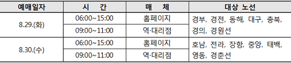 29일은 경부·경전·동해·충북·경의·경원·동해선, 30일은 호남·전라·장항·중앙·태백·영동·경춘선의 승차권 예매가 가능하다.
