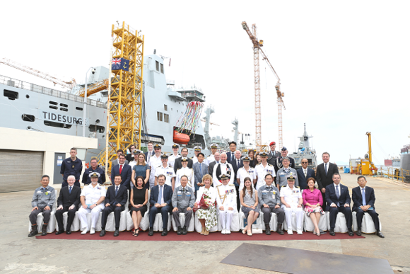 ▲29일 대우조선해양 옥포조선소에서 열린 영군해군 군수지원함 3번함 명명식 행사에서 영군해군 및 대우조선해양 관계자들이 기념촬영을 하고 있다.