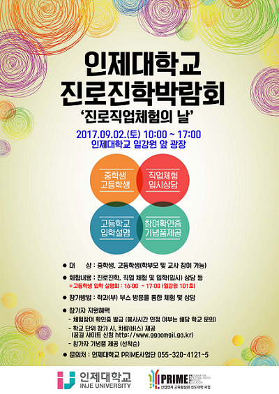인제대학교(총장 차인준) 프라임사업단이 다음달 2일 일강원(G동) 앞 광장에서 진로 진학박람회의 일환으로 '2017 진로직업 체험의 날'을 개최한다.