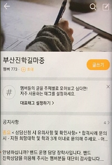 '부산진학길마중'은 휴대폰 등 모바일기기를 통해 언제 어디서나 손쉽게 입시상담을 받아볼 수 있도록 모바일 SNS 서비스(밴드)를 기반으로 운영한다.