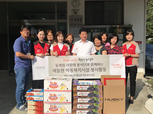 롯데백화점 동래점(점장 류금석) 샤롯데 봉사단은 지난달 29일 부산 소재 새들원 아동복지시설을 방문해 100만원 상당의 과일 및 간식을 지원하고, 청소 봉사활동을 실시했다.