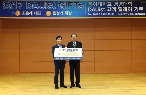 동아대 경영학과 출신으로 현재까지 1억 5천만 원이 넘는 발전기금을 모교에 꾸준히 기부해오고 있는 조 대표는 “릴레이 첫 주자가 되어 영광이고, 기부 문화가 더 확산되길 바란다”며 “학생들이 다우이스트로서의 긍지를 굳건히 하길 바란다”고 말했다.