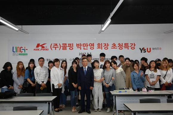 와이즈유 영산대학교(총장 부구욱)가 지난 5일 해운대캠퍼스에서 유명의류회사 ㈜콜핑의 박만영 회장을 초청해 특강을 가졌다.