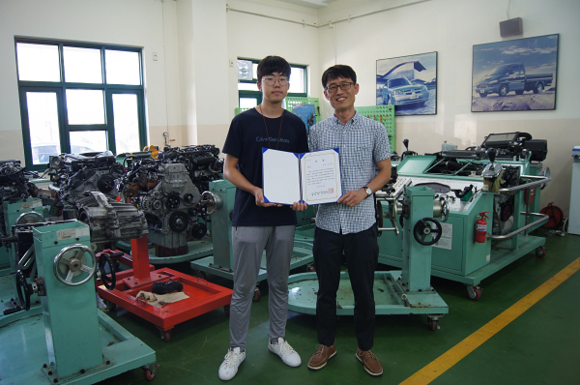 ▲왼쪽부터 동부산 폴리텍 자동차과 이재욱 학생, 지도교수 장성태 교수. (사진=동부산 폴리텍)