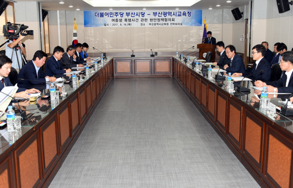 부산시교육청과 더불어민주당 국회의원들이 14일 오전 시교육청 전략회의실에서 부산 여중생 폭행사건 관련 사후대책과 정책·제도적 보완책 마련을 위한 현안정책협의회를 가졌다.