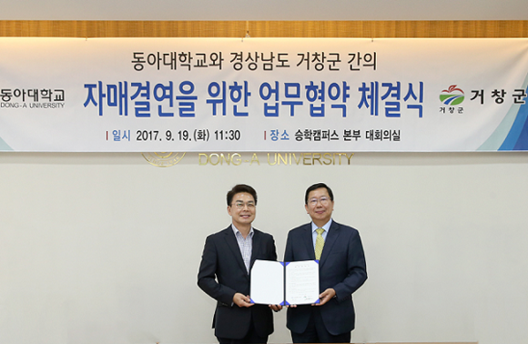 동아대학교와 경남 거창군이 자매결연을 위한 상호협약을 체결했다. 19일 오전 동아대 승학캠퍼스 본부 대회의실에서 열린 협약식에는 김동규 동아대 교학부총장과 하태봉 거창군 부군수 등이 참석했다.