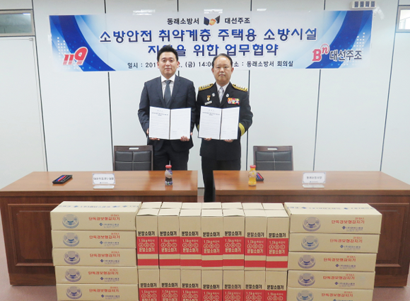 대선주조는 22일 부산 동래소방서와 함께 동래소방서 회의실에서 '소방안전취약계층 주택용 소방시설 지원'을 위한 업무협약식을 가졌다고 밝혔다.