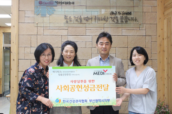 한국건강관리협회 부산건강검진센터(본부장 조승진)는 20일 사회공헌사업의 일환으로 지역 내 소외계층에 대한 사랑을 실천하기 위해 강서노인종합복지관(관장 조휴정)에 사회공헌성금을 전달했다. (사진=부산 건협)