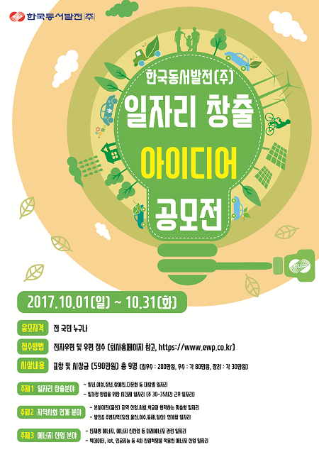 한국동서발전(사장 직무대행 박희성)은 동서발전 노동조합(위원장 김성관)과 함께 사람중심 성장경제의 추진동력을 확보하고 일자리 창출모델을 선도하기 위한 '일자리 창출 아이디어 공모전'을 개최한다고 25일 밝혔다.