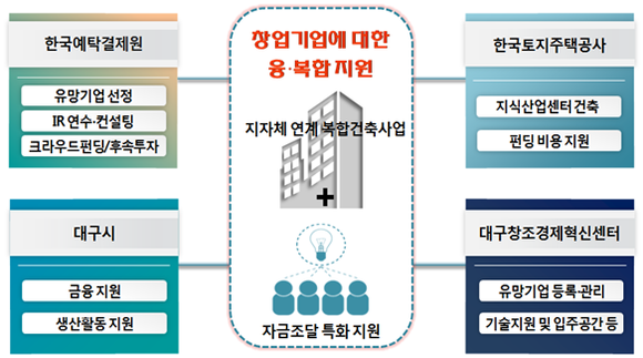 이외에도 대구시는 창업기업의 금융 및 행정지원을, LH는 대구시 관내 스타트업 기업의 크라우드펀딩을 위한 홍보비용 등 착수금 지원 및 마중물 투자를, 대구창조경제혁신센터는 대구시 관내 스타트업 기업 등록·관리 및 기술지원을 할 예정이다.