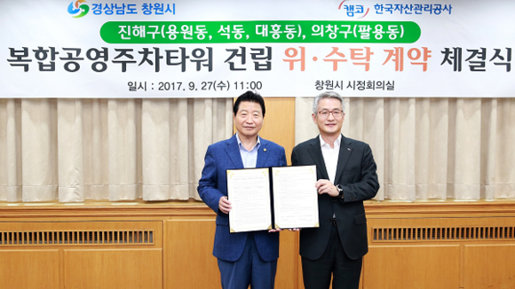 한국자산관리공사(캠코, 사장 문창용)는 창원시(시장 안상수)와 27일 오전 창원시청에서 393억원 규모의 '창원시 진해구, 의창구 복합공영주차타워 건립을 위한 공유재산 개발 및 관리 위탁 계약'을 체결했다.