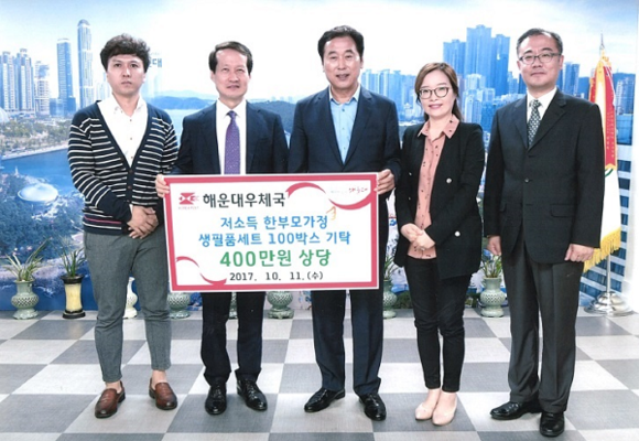 부산지방우정청 해운대우체국(국장 유영철) 행복나눔봉사단은 11일 생활이 어려운 한부모 가정에게 도움을 주고자 해운대구청을 통해 참치캔, 세제, 김, 식용유 등 생필품(400만원 상당)을 전달했다.