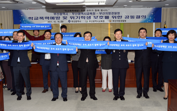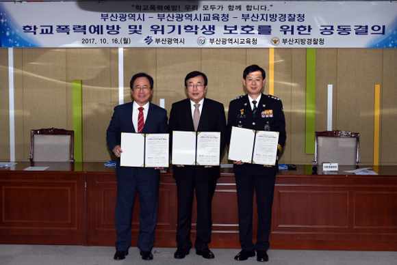 시교육청은 16일 오후 부산시청에서 김석준 부산시교육감, 서병수 부산시장, 조현배 부산경찰청장이 '학교폭력 예방 및 위기학생 보호를 위한 공동결의문'을 채택했다고 밝혔다.