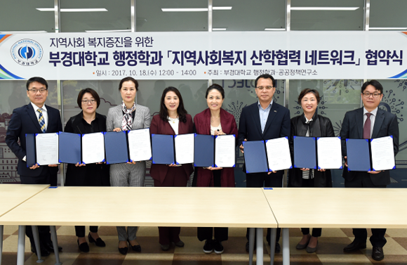 부경대 행정학과(학과장 김은정)는 18일 낮 12시 인문사회·경영관 2층 코어라운지에서 수영노인복지관(관장 윤기혁), 로사사회봉사회 부산종합사회복지관(관장 구춘희), 초록우산어린이재단 부산종합사회복지관(관장 조윤영), 용호종합사회복지관(관장 이춘성), 홀트종합사회복지관(관장 황재필), 가족상담센터 희망의 전화(소장 유옥희), 용호지역아동센터(센터장 김영숙)와 산학협력 네트워크 구축을 위한 협약을 체결했다.