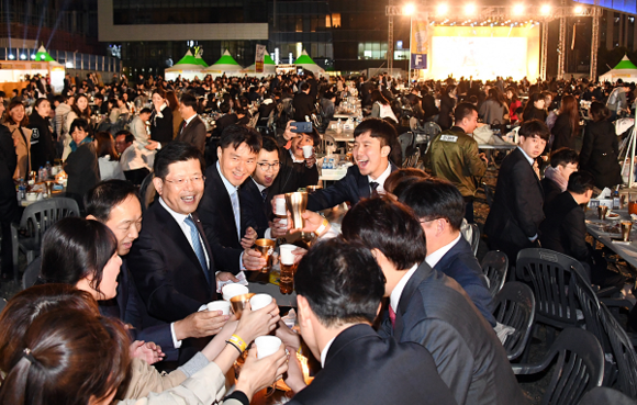 이날 행사에는 해군작전사령부 군악대와 여행스케치가 특별 공연을 펼쳤다. BNK금융지주 김지완 회장도 호프데이에 참석해 부산은행 임직원들과 함께 맥주잔을 기울였다.