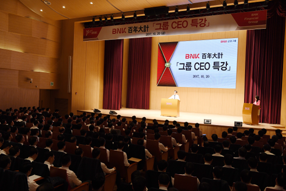 BNK금융지주(회장 김지완)는 20일 오후 부산은행 본점 2층 대강당에서 그룹 경영진 및 임직원 450여명이 참석해 '김지완 회장 CEO 특강'을 개최했다.