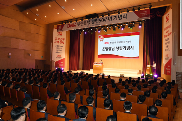 BNK금융그룹 부산은행(은행장 빈대인)은 25일 오전 본점 대강당에서 임직원 500여명이 참석한 가운데 '창립 50주년 기념식'을 갖고 'New Busan Bank' 및 백년은행으로의 도약을 다짐했다.