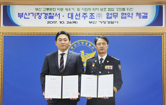 대선주조는 26일 오전 부산 기장경찰서 회의실에서 기장경찰서와 함께 '부산 교통문화 바로 세우기 및 사회적 약자 보호 협업 강화'를 위한 공동협력 협약식을 가졌다고 밝혔다.