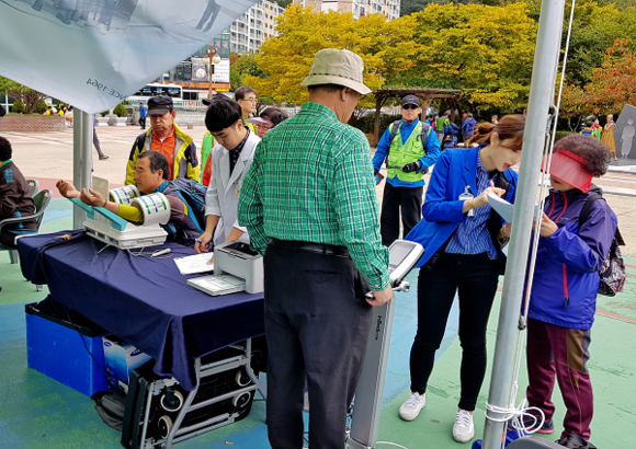 한국건강관리협회 부산건강검진센터(원장 김순관)는 28일 부산학생교육문화회관 광장(성지곡수원지)에서 개최된 '제9회 부산갈맷길축제'에서 건강캠페인을 열어, 축제에 참여한 시민들을 대상으로 혈압 측정과 체성분 검사를 실시했다. (사진=부산 건협)