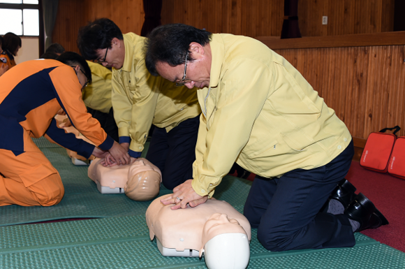 김석준 부산시교육감이 안전한국 훈련 중인 2일 오후 시교육청 대강당에서 교육청 직원 83명과 함께 심폐소생술 교육에 참가, 응급처치 교육을 받은 후 심폐소생술인형을 이용해 흉부압박과 자동제세동기 사용 등 심폐소생술 실습을 하고 있다. (사진=부산교육청)