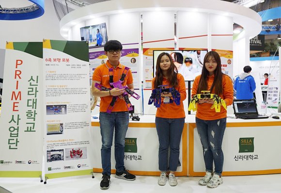 특히 신라대는 '2017 PRIME 4U 캡스톤디자인 경진대회'에서 수상한 '6족 보행로봇' 등 결과물을 전시해 이목을 끌었다. 또한 코딩작업을 통해 로봇을 조작할 수 있는 체험 프로그램을 운영해 많은 관람객들의 흥미를 유발하고, 로봇에 대한 이해도를 높였다.