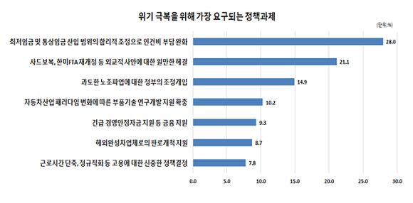 이는 업계의 경영애로와도 직결되고 있다. 조사 응답기업의 경영애로사항을 확인한 결과, '국내 자동차 판매량 감소' 28.3%에 이어 '사드보복에 따른 중국내 완성차 판매량 감소'가 20.2%로 두 번째로 높은 비중을 차지했다. 그 외로는 '최저임금 인상' 19.6%, '완성차업체의 노조파업' 16.1% 등이 주요 경영애로사항으로 지적됐다.