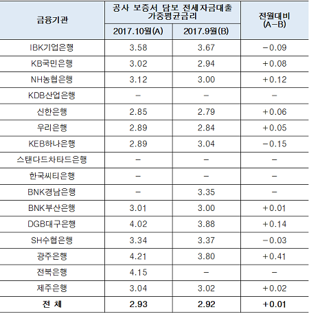 공사는 홈페이지를 통해 각 은행의 전세자금대출 가중평균금리를 공시하고 있다.