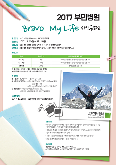 부민병원(이사장 정흥태)은 13일 '2017 Bravo My Life 사진 공모전'을 개최한다고 밝혔다.