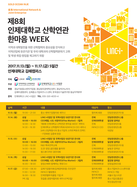 이밖에 산학협력 협의회 세미나, INFACO 힐링캠프, 인제엔젤투자클럽 기업IR 등 다양한 행사로 대학. 기업, 유관기관이 상호정보를 나눌 수 있는 자리를 마련한다.
