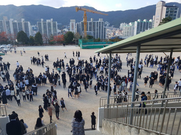 ▲부산 금양중 학생들이 15일 오후 경북 포항시 인근에서 발생한 지진으로 인해 흔들림을 느껴 학교 운동장으로 대피한 모습. (사진=부산교육청)