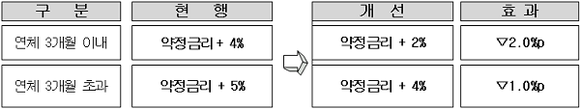 연체이율은 약정이자에 연체가산금리를 부과하는 방식으로 적용되는데 현재 기간에 따라 4~5% 수준인 연체가산금리를 2~4% 수준으로 낮춰 적용한다.