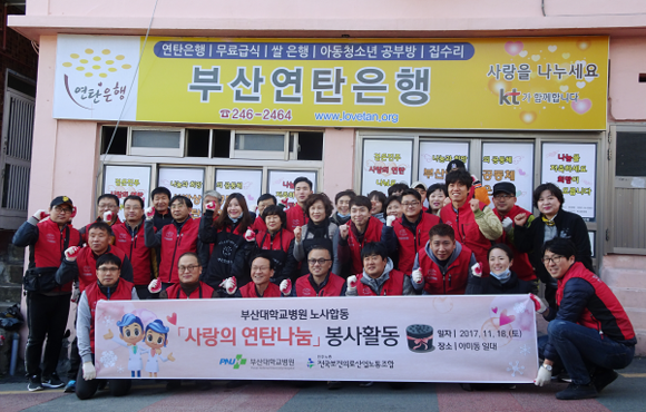 이날 봉사활동은 부산대병원 노사가 상호 존중의 관계 형성을 다짐하며 기부한 금액으로 지역 주민들에게 따뜻한 겨울을 지낼 수 있도록 연탄을 지원하고 병원장 및 노동조합 지부장을 비롯한 병원 보직자와 직원들이 직접 나서 연탄배달 봉사활동을 펼쳤다.