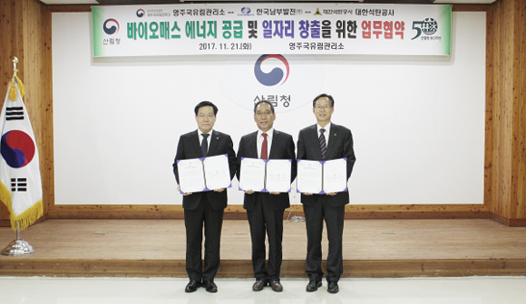 ▲오른쪽부터 남부발전 박석호 신성장사업단장, 영주국유림관리소 강성철 소장, 석탄공사 김순경 기획관리본부장. (사진제공=남부발전)