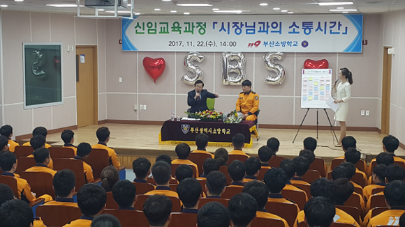 서병수 부산시장이 22일 오후 부산소방학교 강당에서 예비소방관 141명과 함께 소통의 시간을 갖고 인생 경험담과 자신만의 위기극복 노하우를 전하며 시민안전을 위해 최선을 다해줄 것을 당부하고 있다. (사진제공=부산소방)