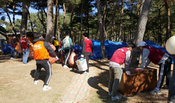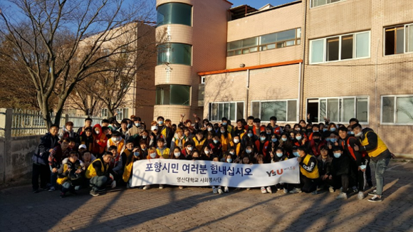 와이즈유 영산대학교(총장 부구욱) 학생 110여명이 21일 지진 피해를 입은 포항을 찾아 자원봉사 활동을 펼쳤다.
