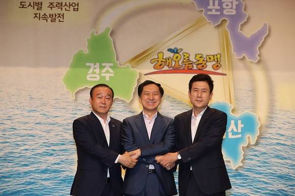 ▲지난 7월 24일 열린 해오름동맹 1주년 정례회에 참석한 김기현 울산시장(가운데)과 최양식 경주시장(왼쪽), 이강덕 포항시장이 기념촬영을 하고 있다.