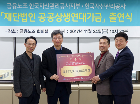 한국자산관리공사(캠코, 사장 문창용)는 24일 오전 전국금융산업노동조합에서 이우승 캠코 부사장, 김상형 캠코 노동조합 위원장, 이병훈 공공상생연대기금 재단 이사장, 허권 금융산업노동조합 위원장 등이 참석한 가운데, 캠코 직원들이 자율적으로 반납한 성과연봉제 인센티브 약 3억원을 공공상생연대기금 재단에 출연했다.