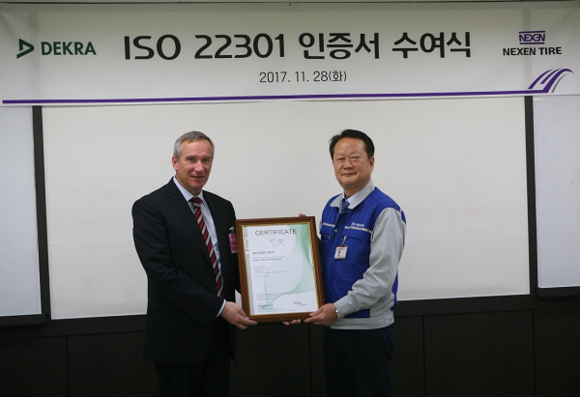 넥센타이어(대표이사 강호찬)가 '사업연속성 관리시스템(BCMS; Business Continuity Management System)'을 구축하며 글로벌 인증기관인 데크라(DEKRA)로부터 국제표준인증 'ISO 22301'을 획득했다고 28일 밝혔다.