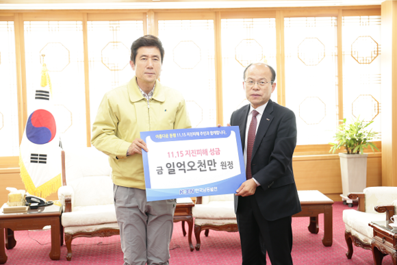 한국남동발전(사장직무대행 손광식)은 30일 경북 포항시청에서 지진으로 큰 피해를 입은 포항시의 빠른 피해 복구를 돕기 위해 성금 1억 5천만원을 전달했다.