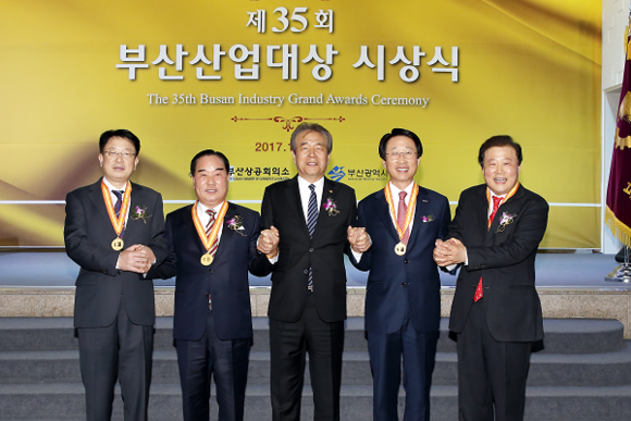 부산상공회의소가 제정·시행하고 부산시가 후원하는 '제35회 부산산업대상' 시상식이 30일 부산상의 2층 상의홀에서 열린 가운데 수상자들이 기념촬영을 하고 있다. 왼쪽부터 동성화학 이경석 대표이사(근로복지대상), 금성볼트공업 김선오 대표이사(기술대상), 부산상의 조성제 회장, 에어부산 한태근 대표이사(봉사대상), 은산해운항공 양재생 대표이사(경영대상). (사진제공=부산상의)