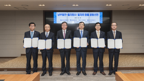 남부발전은 29일 본사 35층 비전룸에서 '좋은 일자리 창출을 위한 공동 선언식'을 개최, KOSPO영남파워 등 6개 출자회사와 지속가능한 일자리 창출과 일자리 중심의 경제를 구현하는데 적극 협력키로 했다.