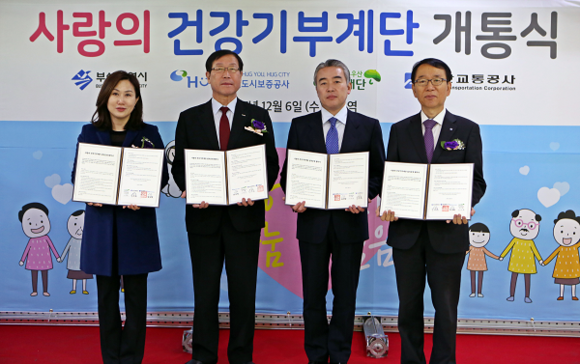 ▲왼쪽부터 이수경 초록우산 어린이재단 부산본부장, 손종철 HUG 부사장, 박재민 부산시청 행정부시장, 박종흠 부산교통공사 사장. (사진제공=HUG)