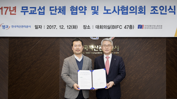 ▲오른쪽부터 캠코 문창용 사장, 김상형 노조위원장. (사진제공=캠코)