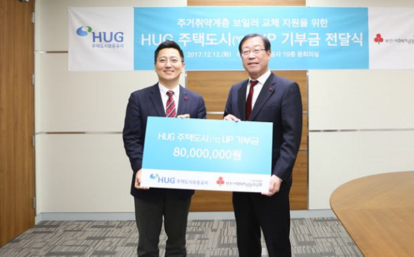▲주택도시보증공사가 12일 사회복지공동모금회 부산지부를 통해 취약계층 보일러교체 지원 기부금을 전달하고 있다. 사진 우측부터 손종철 HUG 부사장, 박은덕 사회복지공동모금회 부산지부 사무처장. (사진제공=HUG)