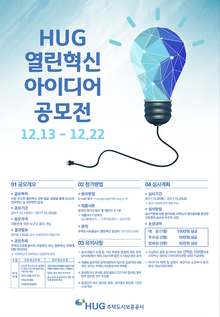 주택도시보증공사(HUG, 사장 김선덕)가 시민사회 의견을 적극 반영하기 위해 오는 22일까지 'HUG 열린혁신 아이디어 공모전'을 진행한다.