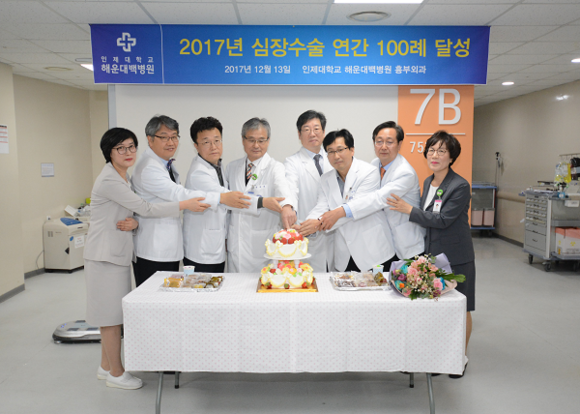 인제대학교 해운대백병원(원장 문영수)이 올 한 해 동안 심장수술 100례 달성을 기념하는 의미로 13일 병원 7층 병동에서 자축연을 가졌다.